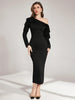 ASYMMETRICAL SHOULDER RUFFLE TRIM WAIST CINCHED WAIST MIDI DRESS