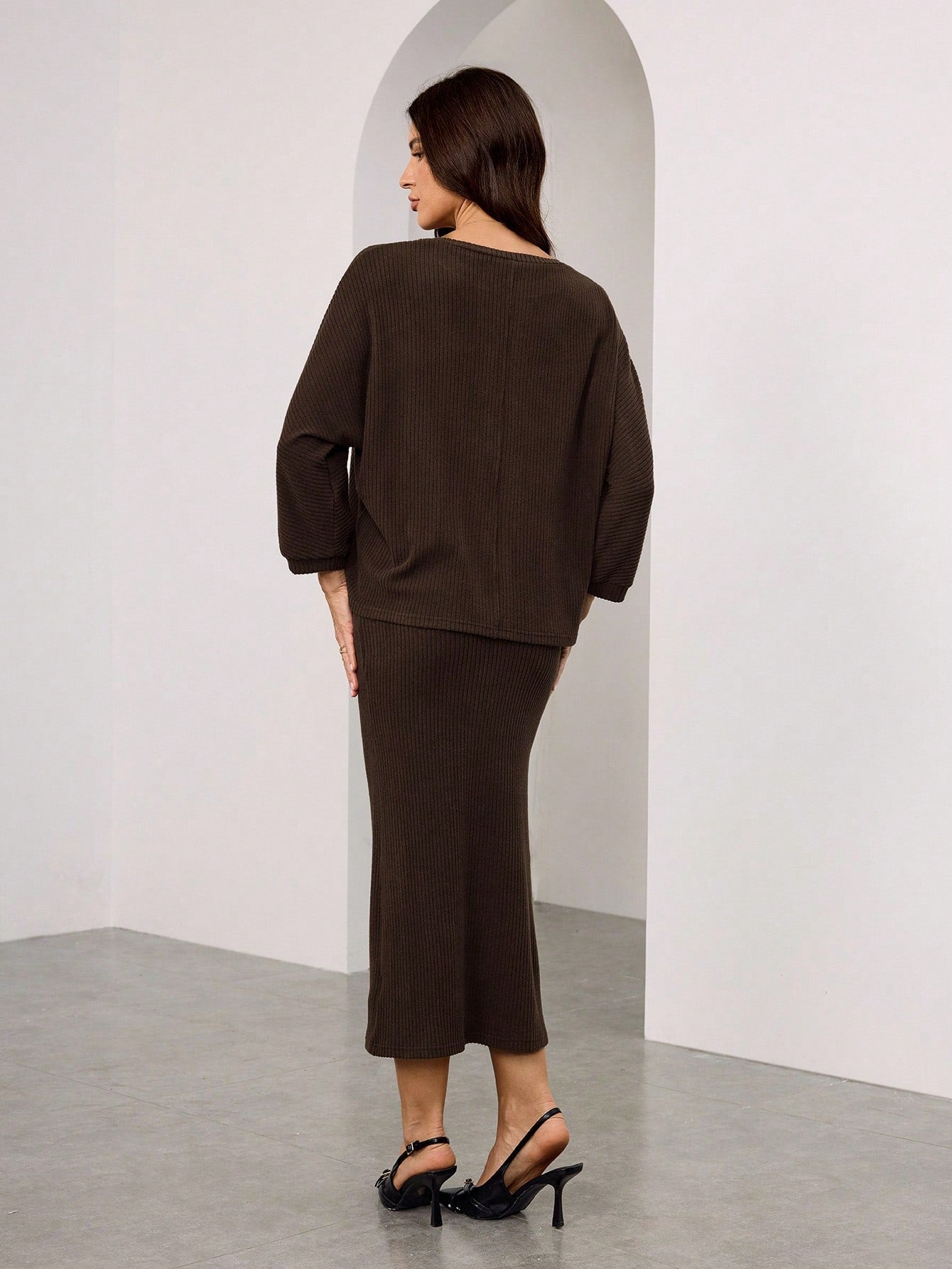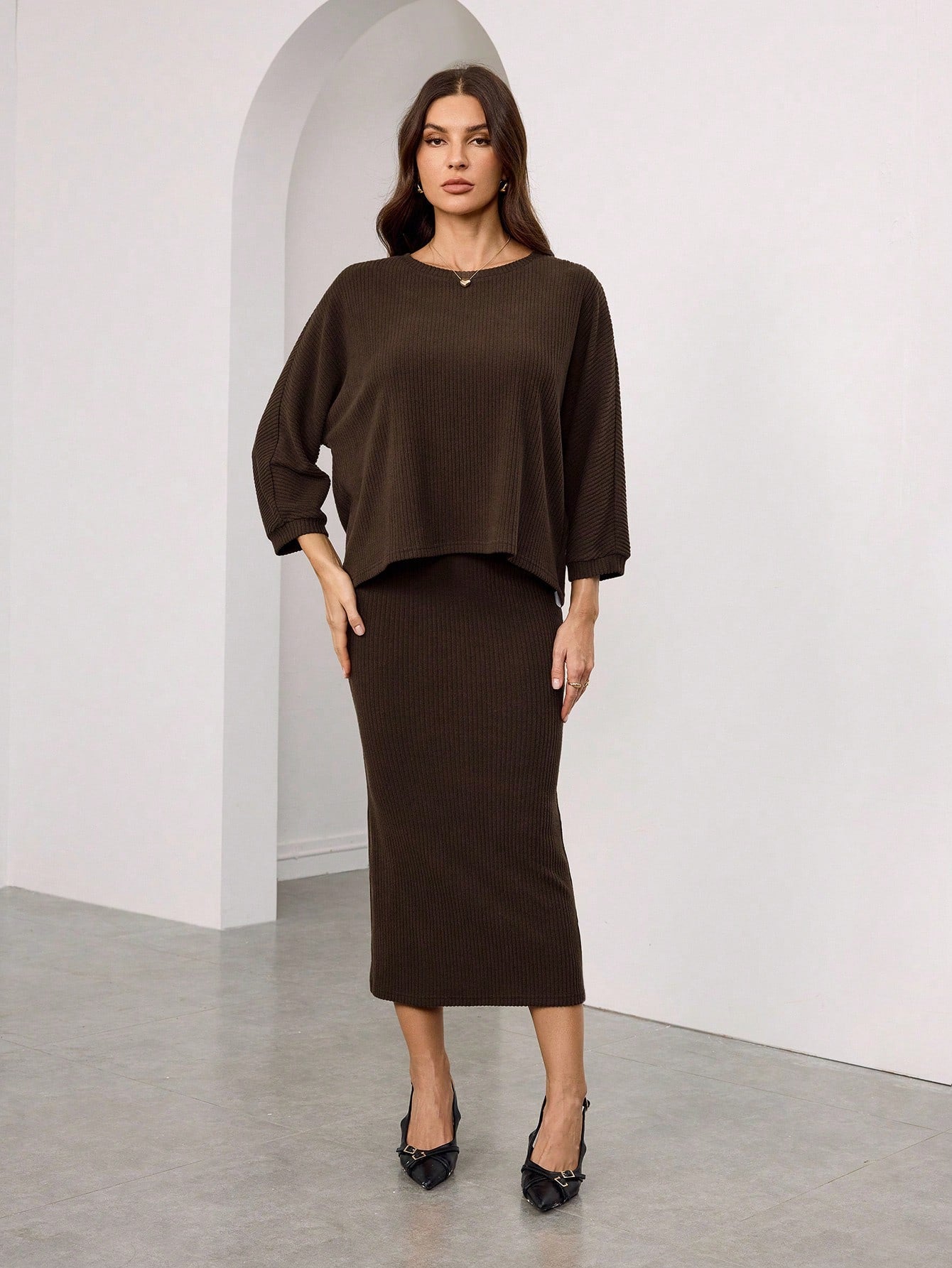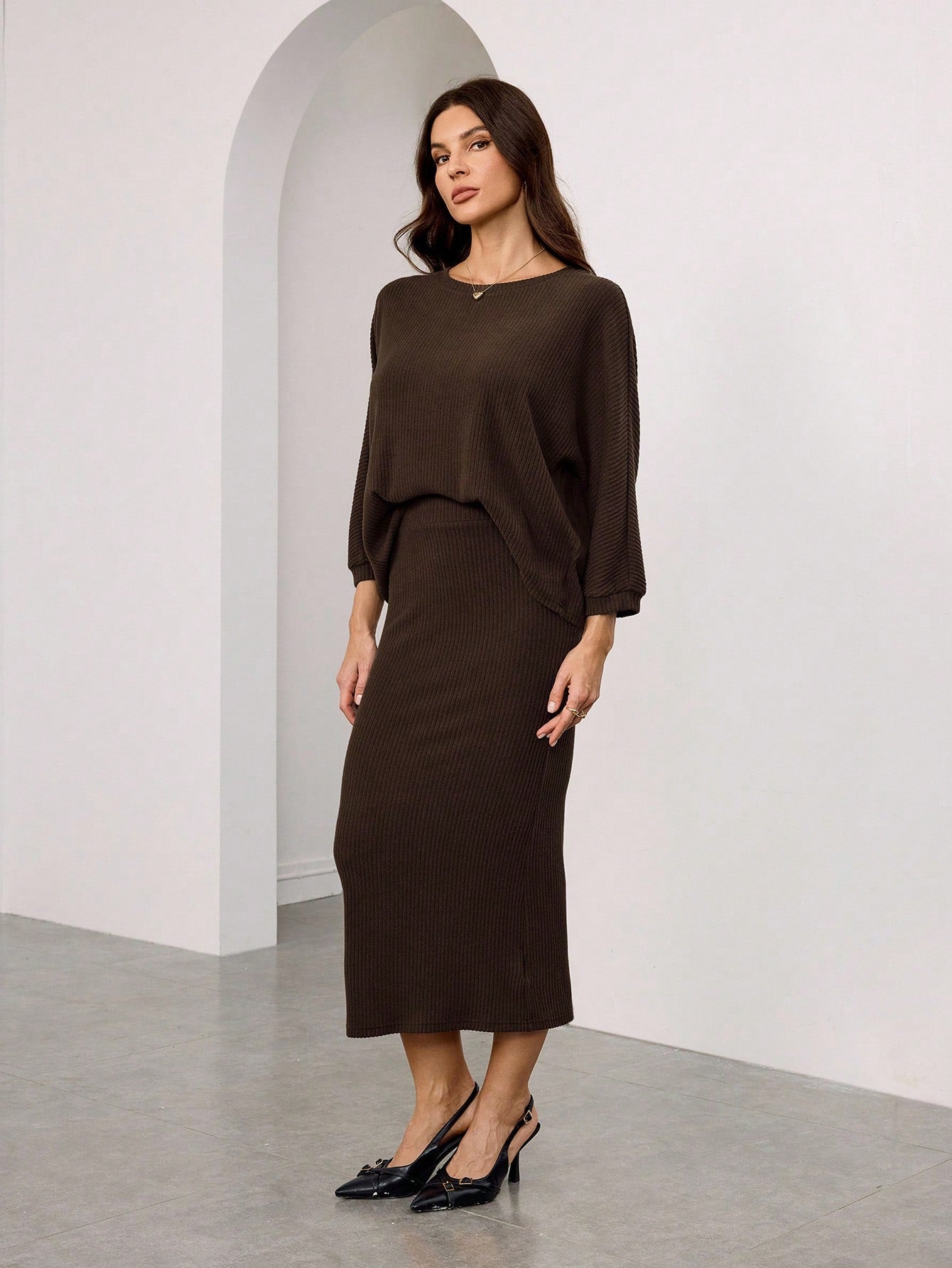 WOMEN BATWING SLEEVE ROUND NECK T-SHIRT AND MID-LENGTH STRAIGHT SKIRT